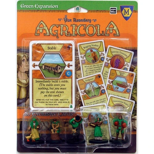 Agricola: Green Expansion is both an upgrade kit for the revised edition of Agricola as well as an expansion. This item contains five pre-painted miniatures with colored accents that can replace one set of wooden player pieces from the base game. In addition, it contains twenty new cards for Agricola, including some that are exclusive to this expansion.
