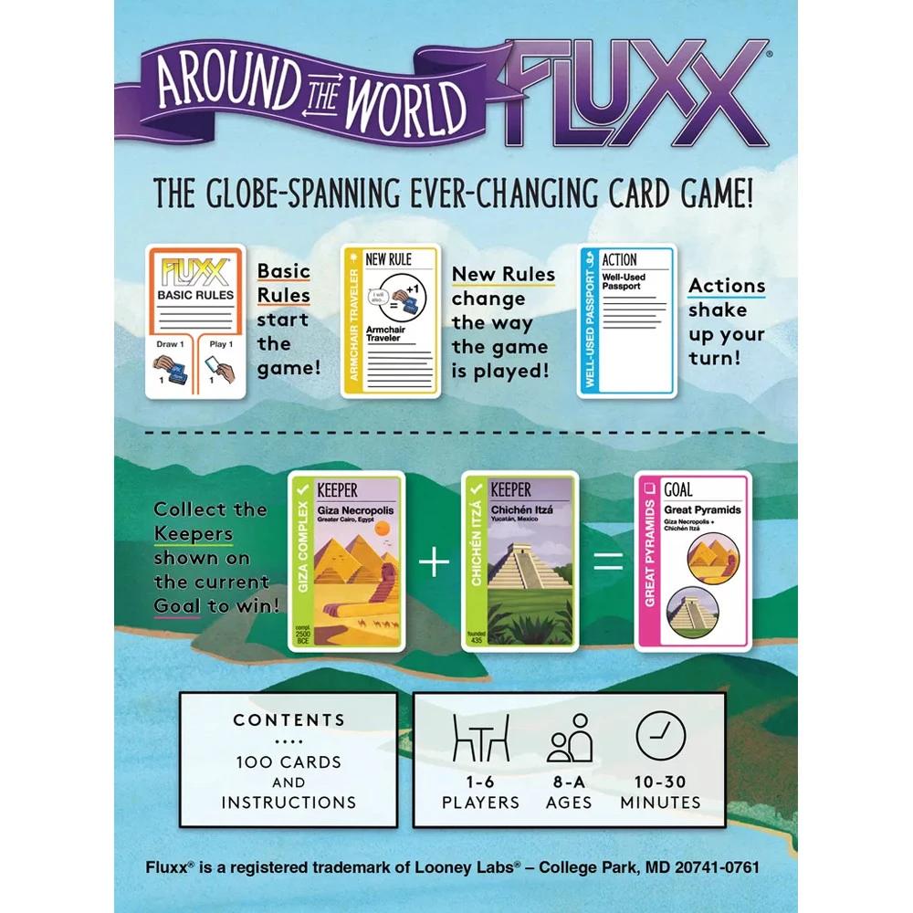 It’s a trip around the world in 100 cards! This travel-themed version of Fluxx includes 25 world famous landmarks and a variety of fun new Actions and New Rules. Featuring beautiful artwork from the same artist who illustrated Across America Fluxx, the two versions are designed to be combined for double the Bucket List fun!