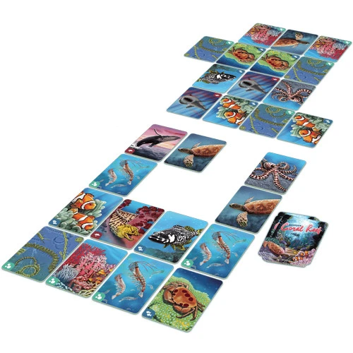 Dive deep to build your own ecological network in Ecosystem: Coral Reef, a card-drafting game of marine competition. Players choose, pass, and arrange cards representing a diversity of organisms found in the Great Barrier Reef, including coral, clownfish, sea turtles, and sharks. Earn points by aligning animals with the habitats and food sources where they most flourish. Diversify your food web to maximize your bonuses. Each time you play, you build a one-of-a-kind ecosystem as you strive to balance the delicate connections between all living things.
