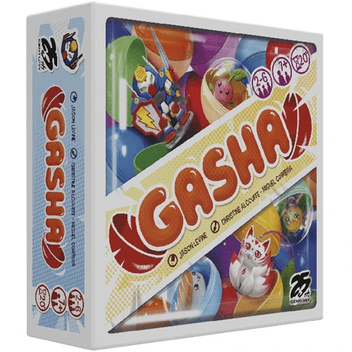 On your turn in Gasha, you either draw two Gasha cards or trade Gasha cards for a set reward card, which counts as points while also being half of a ticket. As soon as you have two ticket halves, you draw a bonus token. When the last bonus token has been taken or when the set reward pile is empty, the game ends and whoever has the most collection, bonus and Gasha points wins.