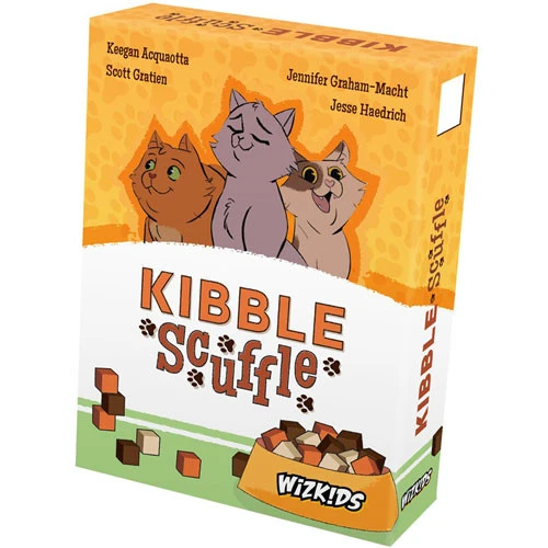 …and they all need to eat. Clash their personalities in fun and exciting ways to feed them kibble and win the game. Using the game box as a cat food box to store the food cubes, players take turns placing their cats and resolving their abilities. For example, the Pounce Cat removes a cat at a bowl. The Greedy Cat eats two food cubes. The Mangy Cat forces another cat to move away from their bowl. Once there are 5 cats at any food bowl, the feeding (scoring) phase begins, followed by a new round.