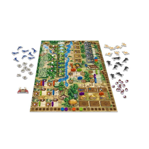In Kingdom of Middag, players are the leader of their own tribe who tries to lead their people to a fruitful harvest and glory. By sending tribe members to the Hunting Field, Tool Hut, Trade Hut, or Worship Hut, players will gain different preys, improve their hunting skills, or trade preys for victory points. Challenge players to optimize their action timing to gain the most useful resources and turn them into victory points efficiently. The player who earns the most victory points will become the new king and transcend the greatness of Kingdom of Middag.
