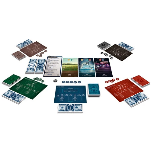 In Ozark, factions fight to expand their control over the city and to launder their money. Take the role of the Byrde Family, the FBI, the Navarro Cartel, the Kansas City Mob, or the Townsfolk and spread influence throughout the town. Control as many properties as possible to earn their benefits and secure your power to stash the most money.