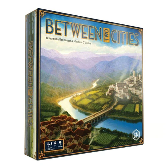 Between Two Cities is a tile-drafting game in which each tile is part of a city. You work with the player on your left to build one city center while simultaneously working with the player on your right to build a second city center. On each turn you select two tiles from your hand, reveal them, then work with your partners to place one of your selected tiles into each of your two cities.