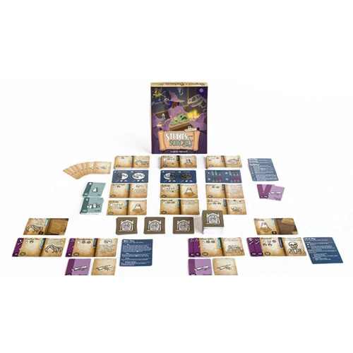 Studies in Sorcery is a competitive engine-building and drafting game in which players are trying to complete projects in different areas of study to complete their thesis statement and earn enough credits to become the valedictorian of the Academy of Dark Arts!