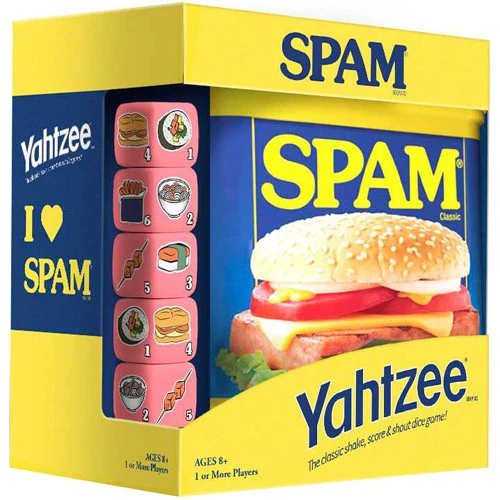 Play with your food in this ready-to-consume version of the classic “Shake, Score & Shout” dice game! Yahtzee: Spam Brand serves up a slice of fun and nostalgia with custom dice featuring your favorite SPAM servings.